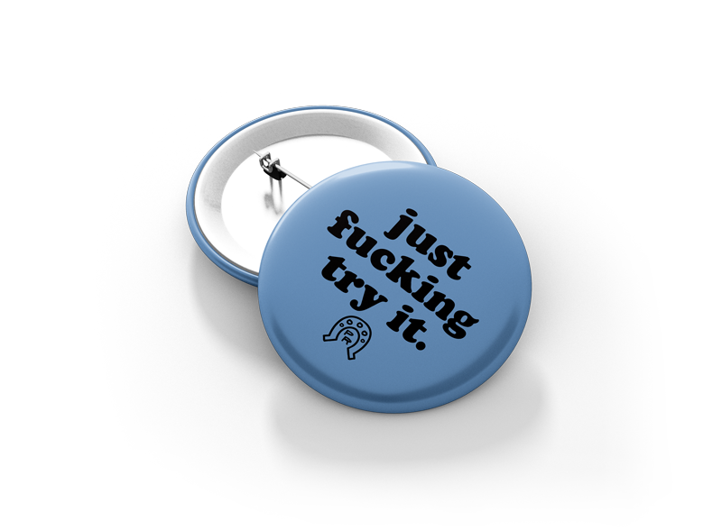 1" mini button in Misty Blue with the infamous Polychrome Ranch + Make Sound Good studio saying "Just f*cking try it."